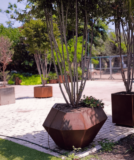 על עץ לגרסטרמיה (Lagerstroemia) רב-גזע, שתול במיכל גיאומטרי עשוי פלדת קורטן- צורה גאומטרית