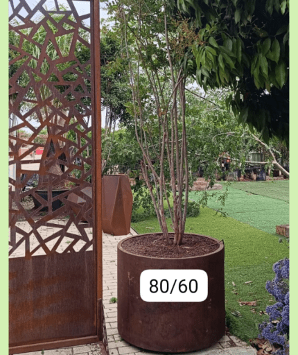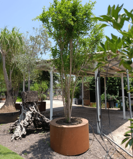 עץ לגסטרמיה רב-גזע שתול באדניות קורטן מעוצבות עגולה גבוהה
